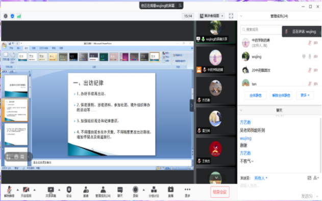 吴静老师从出访纪律、出访安全两方面为同学们进行详细指导。在出访纪律上强调同学们在出访手续办理、安全保密原则、境外组织观念和纪律意识、证照管理等方面要提高纪律意识。在出访安全方面上要求同学们务必在出行安全、校园安全、财产安全、社交娱乐安全等方面提高安全意识。周静科长补充要求,疫情形势仍然严峻,同学们境外学习生活要做好防护、增强自我保护能力,学习生活要时刻保持与学校老师联系、并及时做好总结。培训后,同学们都表示在境外学习中会时刻严守纪律,保证安全,做到“高高兴兴学习、平平安安生活”。